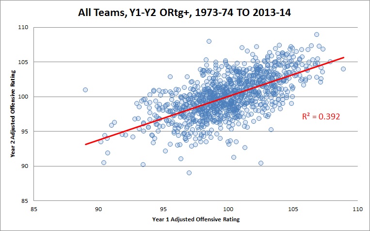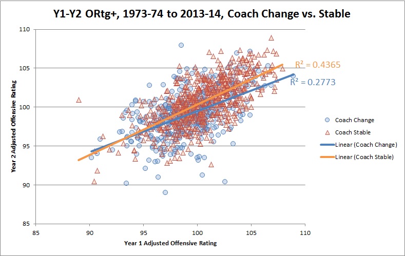 What we see here is that teams who retained their coaches had more stable offenses than those who did not. Teams with the same coach can explain about 44 percent of their offensive rating simply by looking at the prior year, while that’s only true for 28 percent of offensive variance for teams with new coaches.